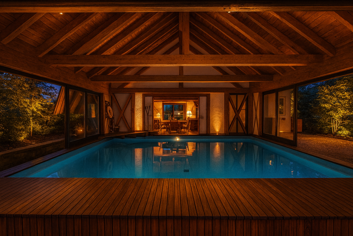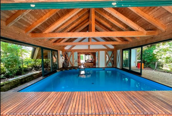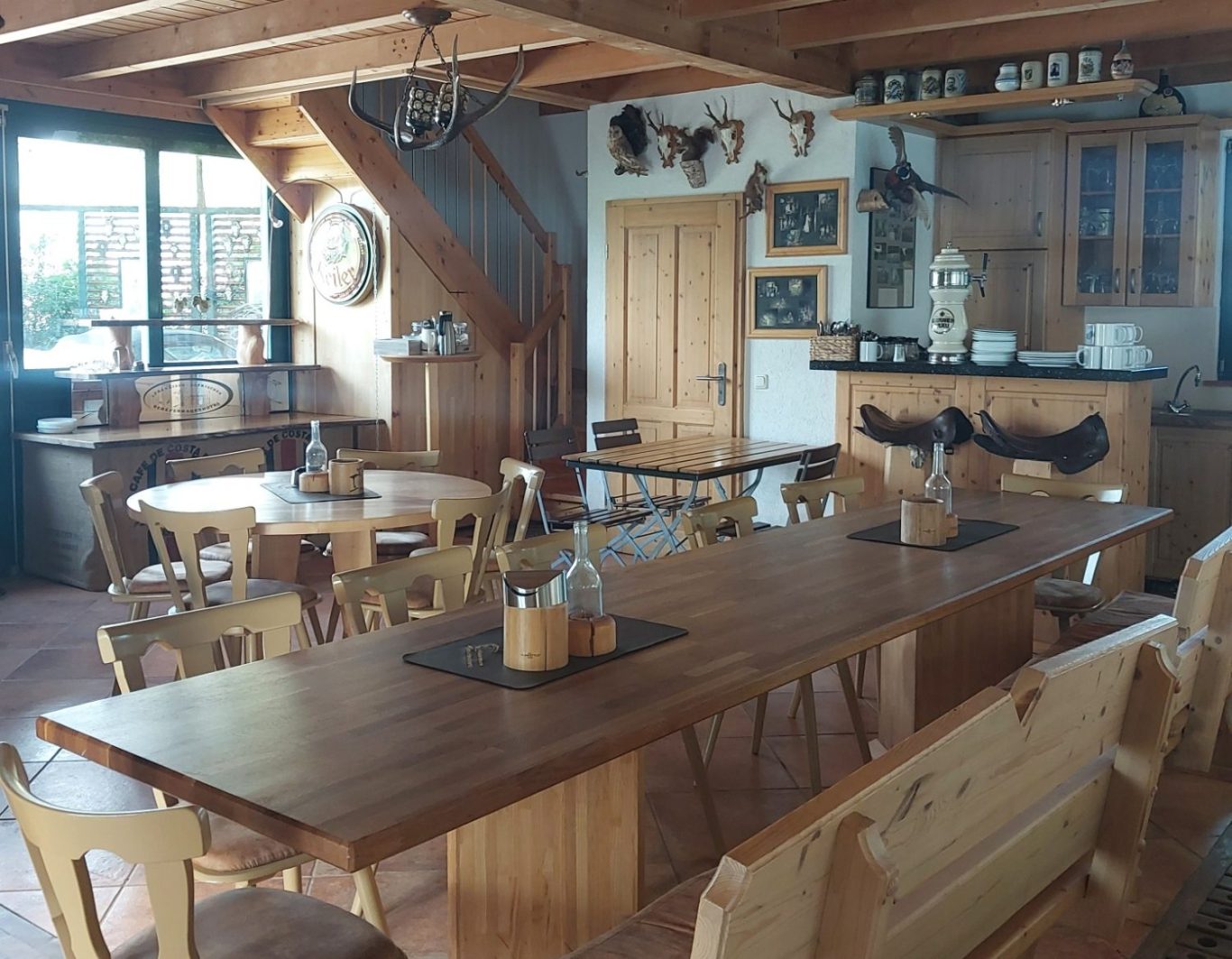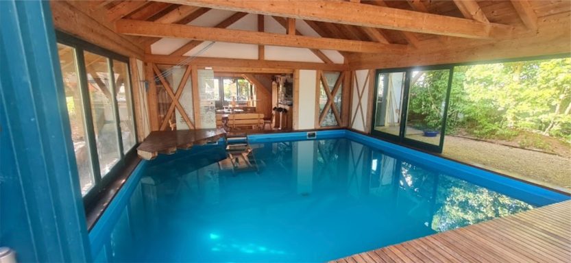 Im Sommer lässt sich die große Glasschiebetür in der Jägerstube öffnen, sodass sie direkt in den Poolbereich gelangen.